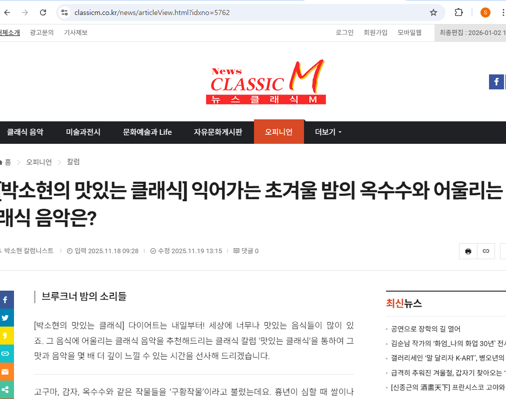 [박소현의 맛있는 클래식] 익어가는 초겨울 밤의 옥수수와 어울리는 클래식 음악은? - 뉴스클래